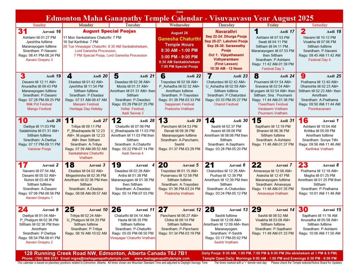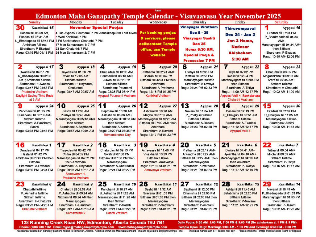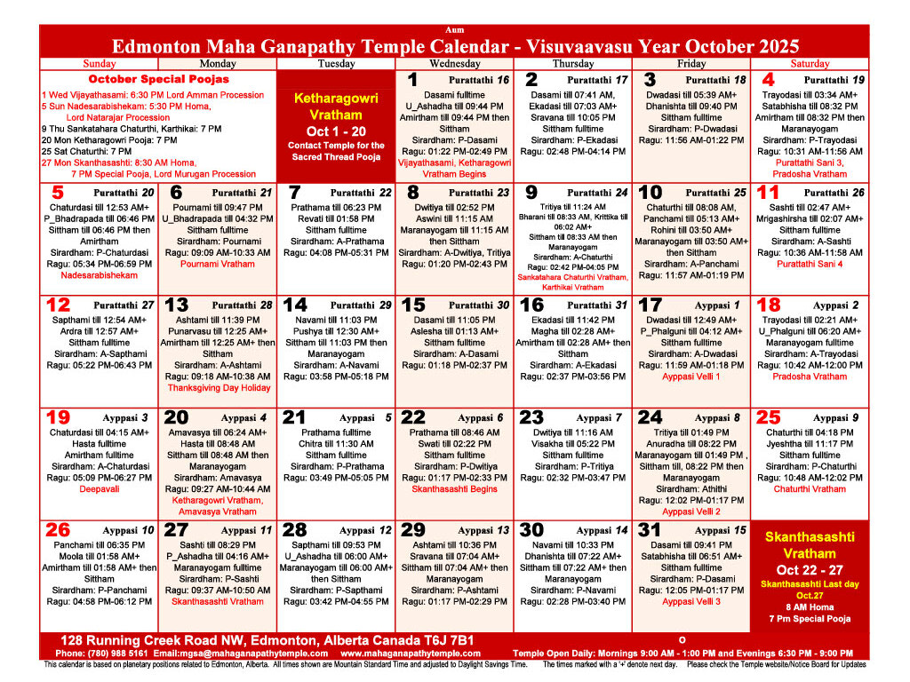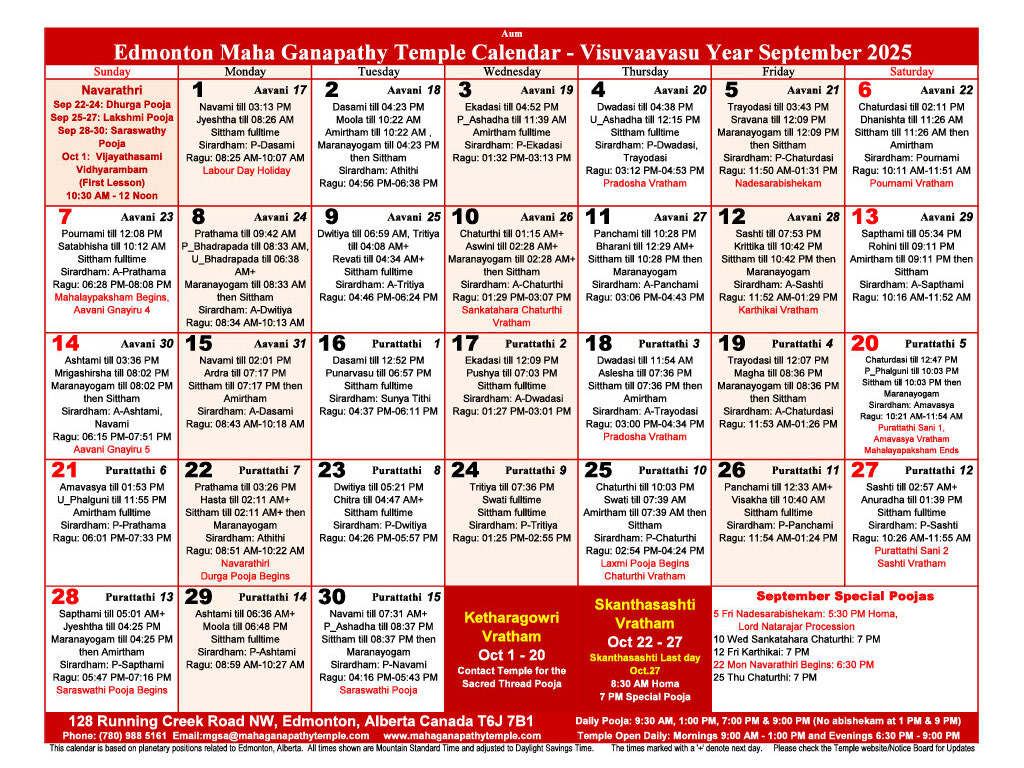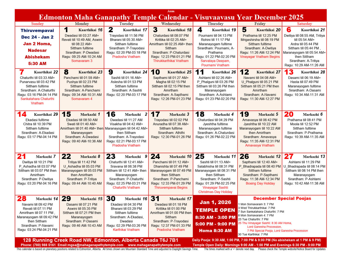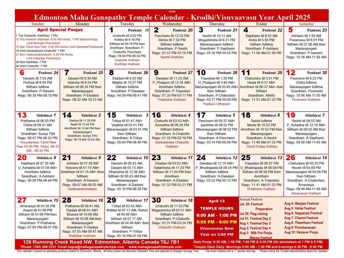 Edmonton Maha Ganapathy Temple Calendar - Krodhi/Visuvaavasu
